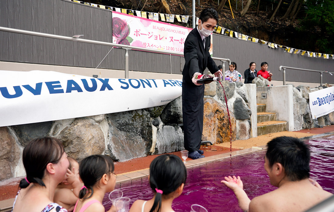 Японцы радуются празднику Божоле нуво. Уже который год на курорте Хаконэ, знаменитом своими горячими источниками, гостям предлагают ванну с молодым вином. Согласно законам Франции, вино свежего урожая официально презентуется в третий четверг ноября.