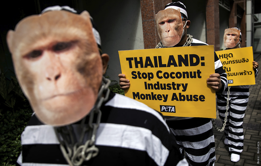 Активисты движения за права животных PETA выступили против жестокого обращения с обезьянами в кокосовой промышленности Таиланда. Акция прошла возле посольства Королевства Таиланд в Маниле, Филиппины.
