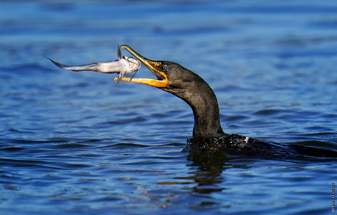 Ушастый баклан ловит рыбу на реке в американском штате Мэриленд