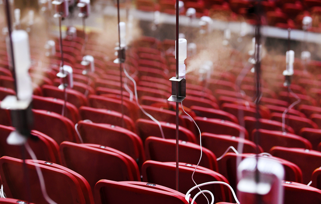 Голландские ученые проводят исследование дезинфицирующих аэрозолей на фанатских трибунах. В случае успеха футбольные фанаты смогут безопасно находиться на стадионах. На фото: генераторы и датчики аэрозоля на стадионе Johan Cruijff Arena в Амстердаме.