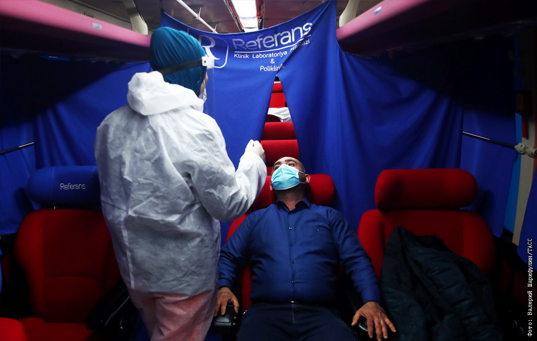 Азербайджан ужесточает карантинный режим из-за коронавируса с 14 декабря. На фото: медицинский работник во время тестирования местного жителя в мобильном пункте в Баку.
