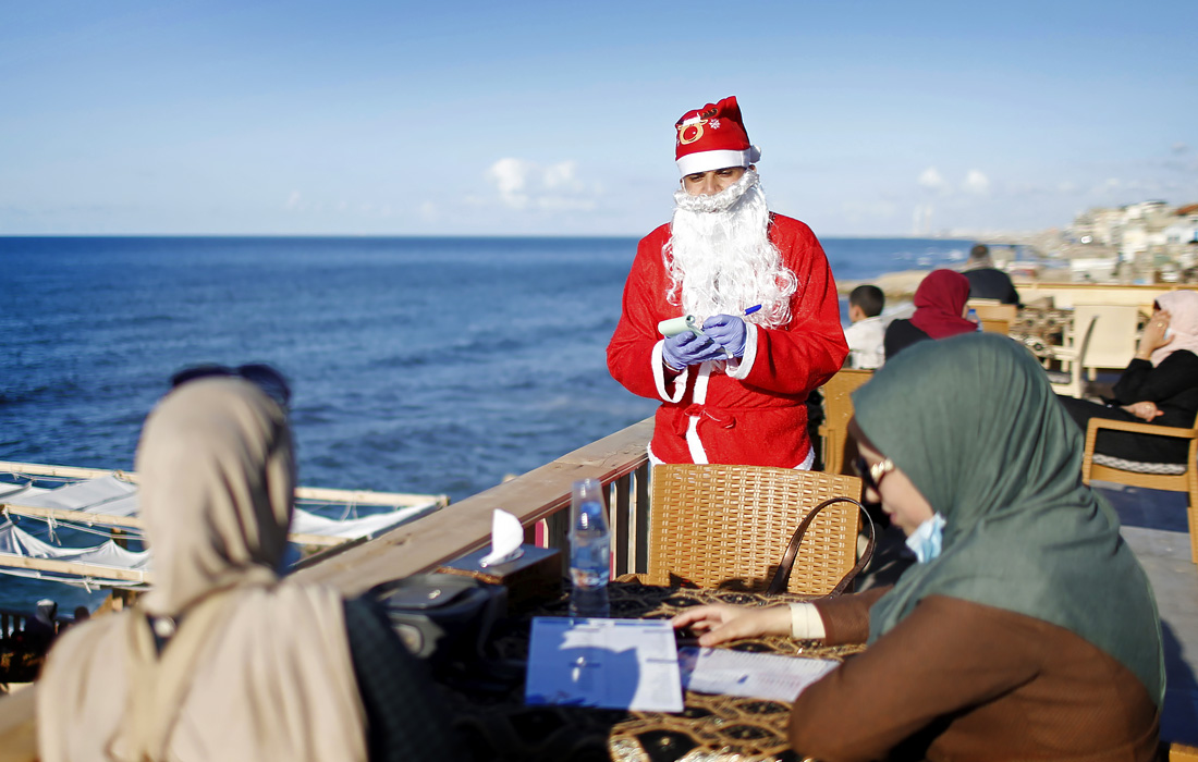 Официант в костюме Санта-Клауса принимает заказ в кафе на пляже в городе Газа