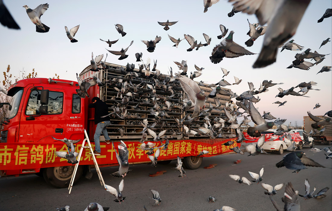 В Китае прошли гонки голубей. Во время соревнований птицы могут преодолевать более тысячи километров, развивая скорость не менее 70 км/ч.