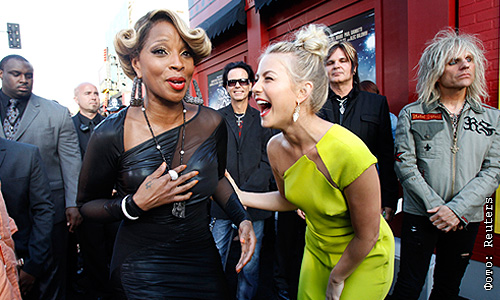 Певица Мэри Джей Блайдж и актриса Джулианна Хаф на премьере фильма "Рок на века" в Голливуде.