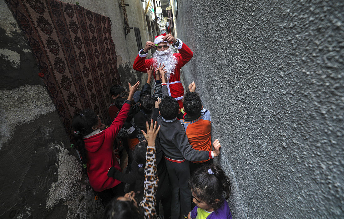 Палестинец в костюме Санта-Клауса раздает конфеты детям из лагеря беженцев Аль-Шатеа в городе Газа