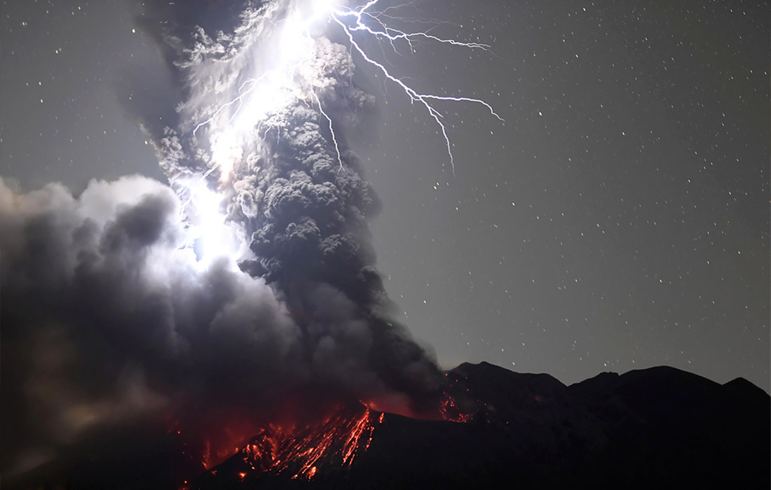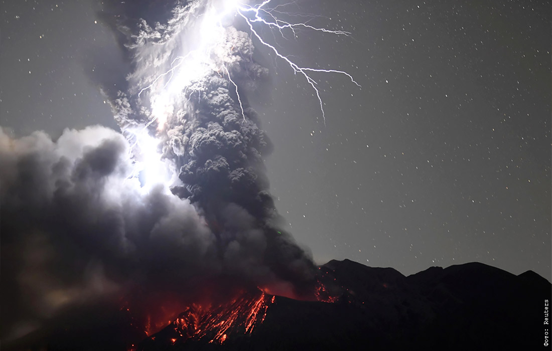 Молнии над действующим вулканом Сакурадзима в японской префектуре Кагосима