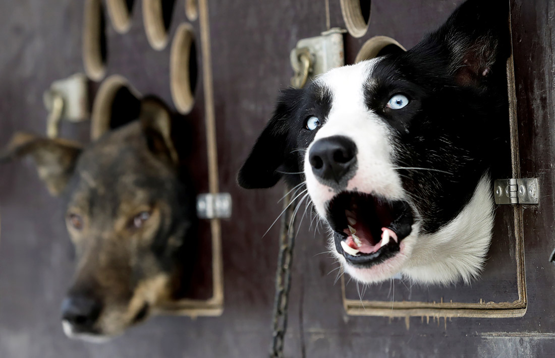 Собаки перед гонкой на собачьих упряжках в Орлицких горах в Чехии