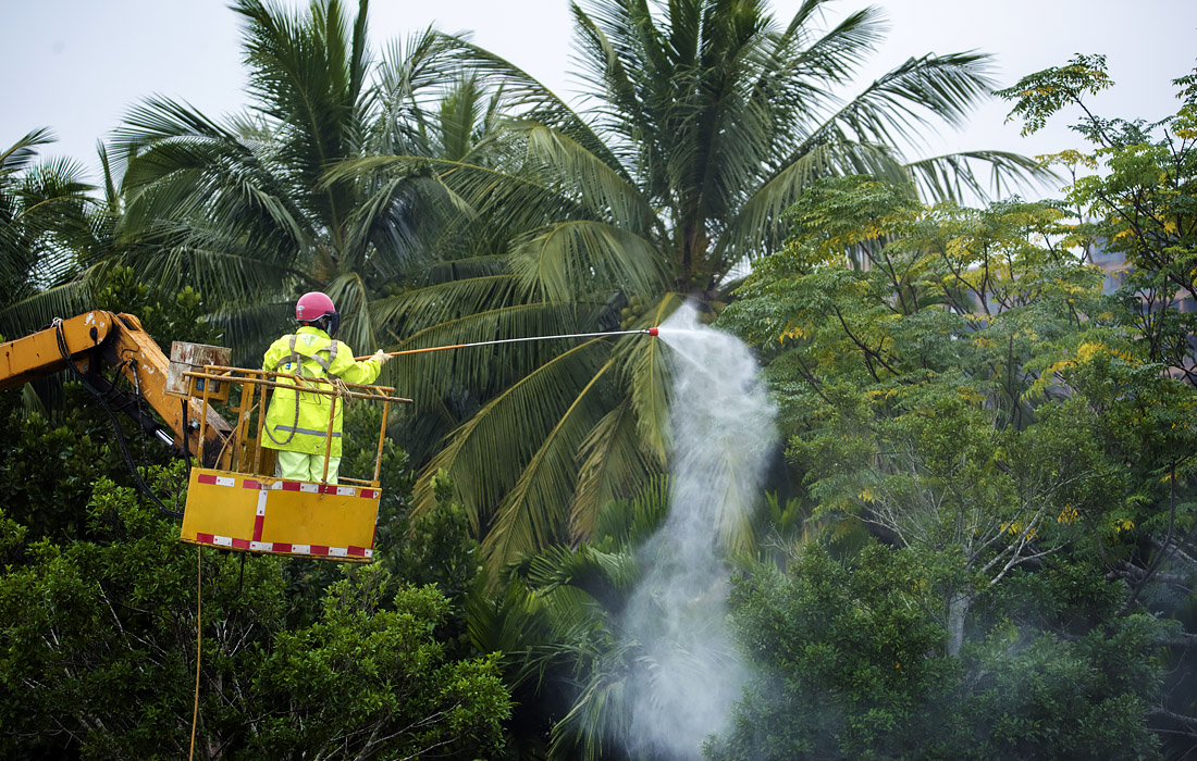 Садовник распыляет пестициды на деревья в провинции Хайнань, Китай