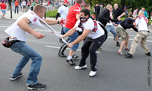 Драка польских и российских фанатов во время марша российских болельщиков.