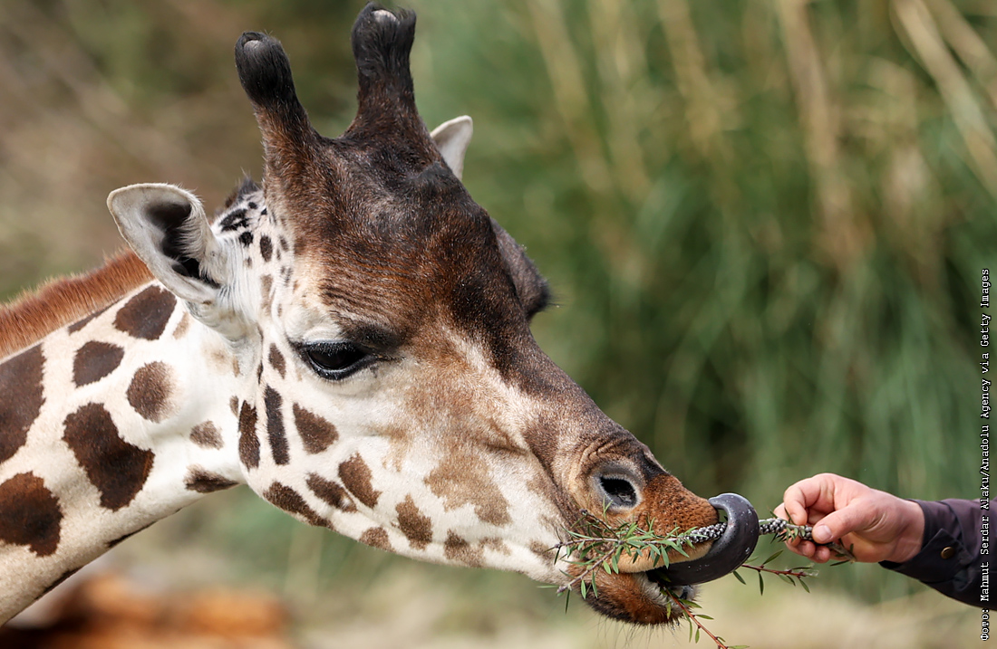 Жираф во время кормления в парке дикой природы турецкого Измира, который закрыт в рамках мер по борьбе с коронавирусом