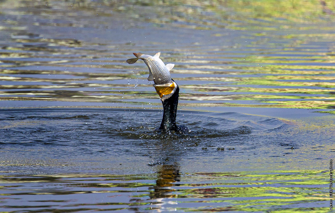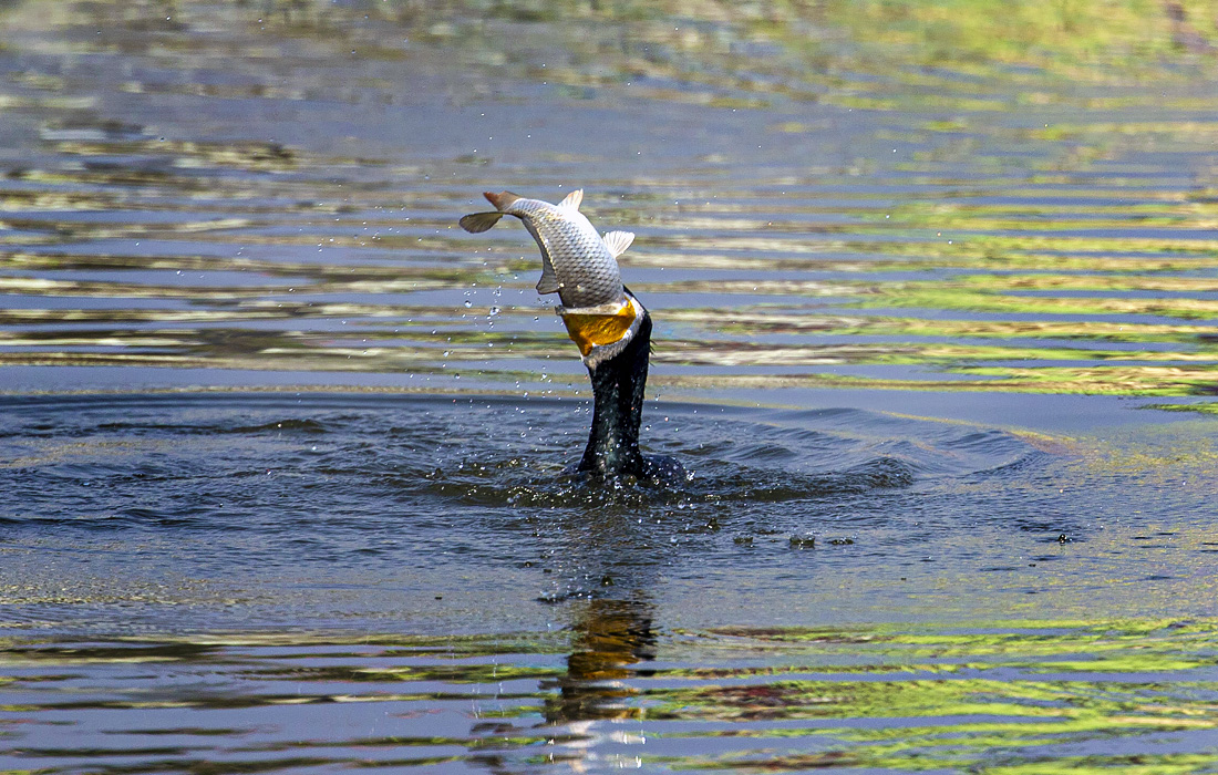 Большой баклан ловит рыбу на озере Таудаха в Катманду