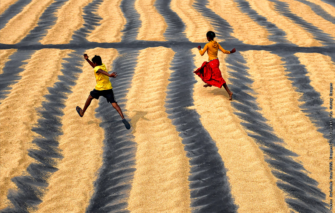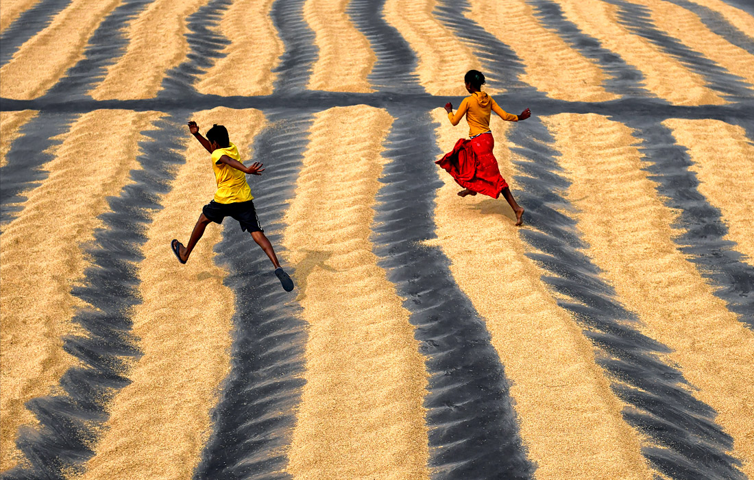 Дети играют на рисовом поле в Шантипуе, Индия