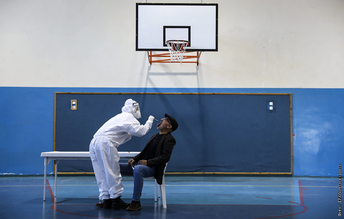 Израильский медик собирает образцы мазков для тестирования на COVID-19 во время национальной изоляции в спортзале в Бейт-Шемеш