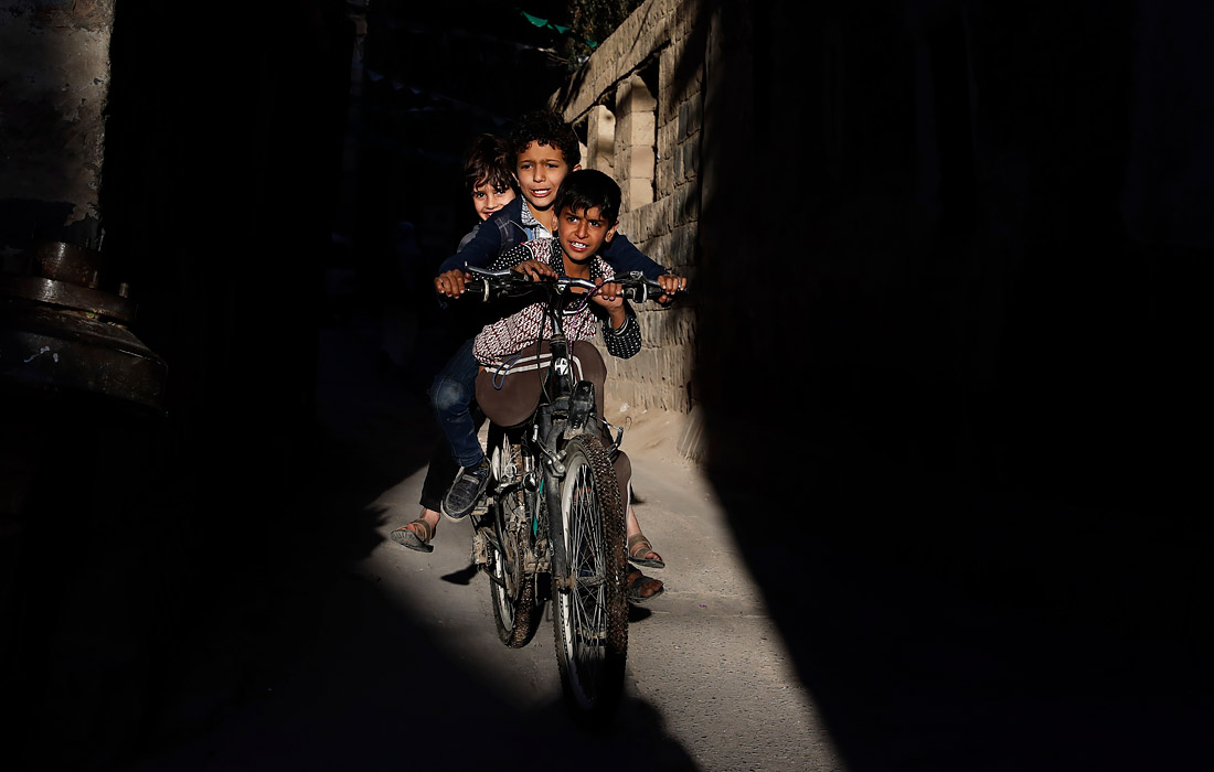 Дети катаются на велосипеде в старом городе Саны, Йемен