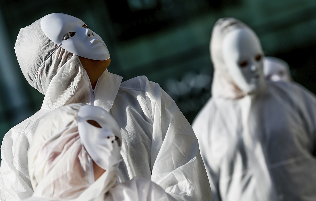 20 февраля. Люди, одетые в защитную одежду, собирались перед театром Ла Монне в знак протеста против карантинных мер, принятых правительством в Брюсселе, Бельгия.