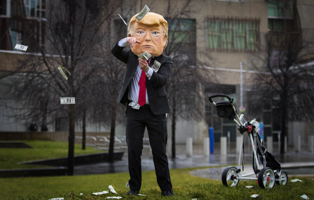 Протестующий в Эдинбурге перед дебатами в шотландском парламенте, где будет решаться вопрос, следует ли правительству расследовать финансирование Дональдом Трампом шотландских полей для гольфа