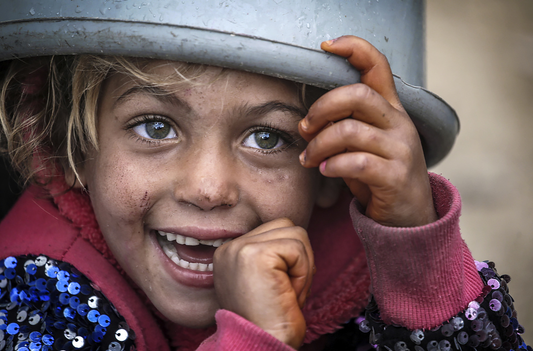 Палестинская девочка со своей миской ждет раздачи бесплатной еды на востоке города Газа