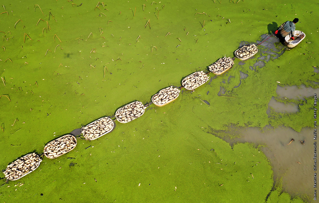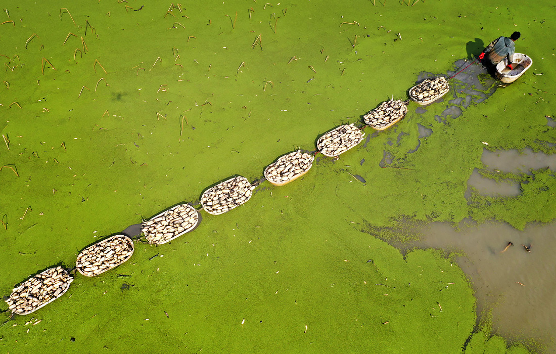 Сбор корней лотоса в округе Анлонг, Китай