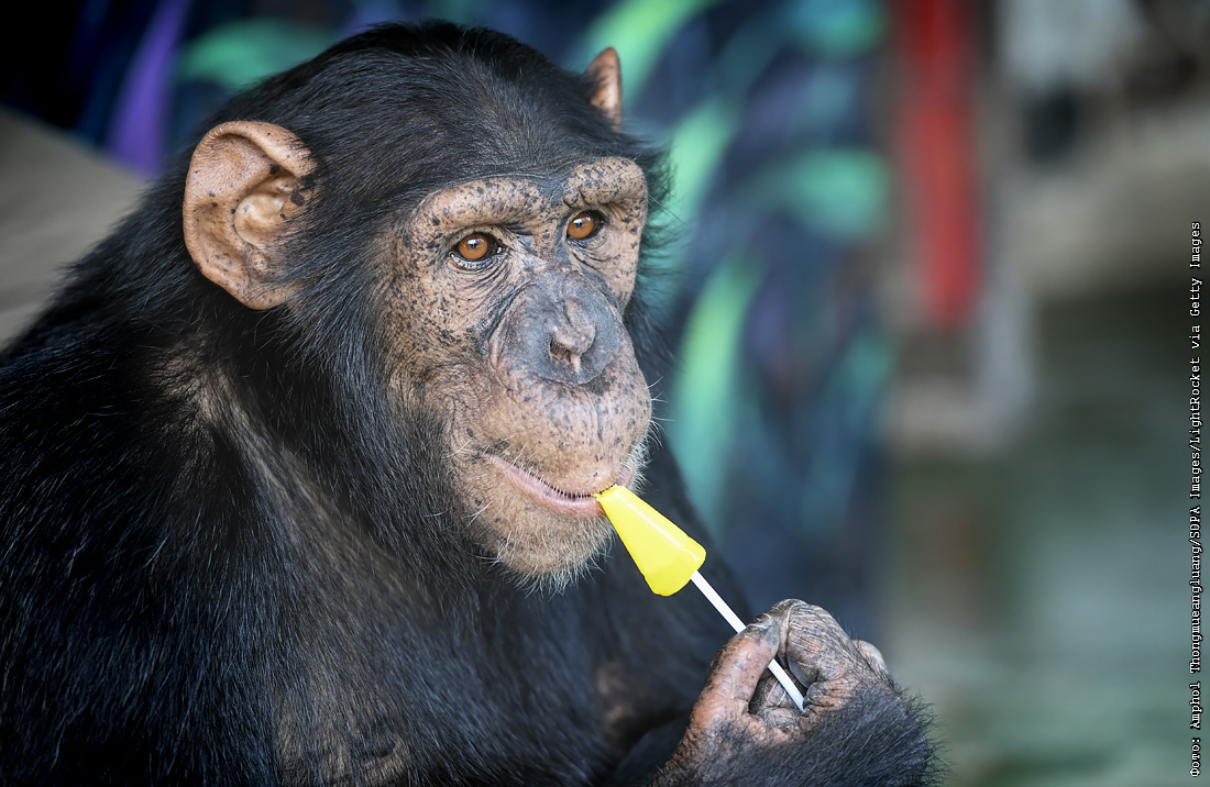 Шимпанзе ест конфеты в зоопарке Самутпракан, Тайланд