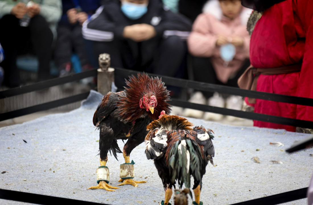 Люди наблюдают за петушиными боями в городском парке Кайфына в четвертый день китайского Нового года