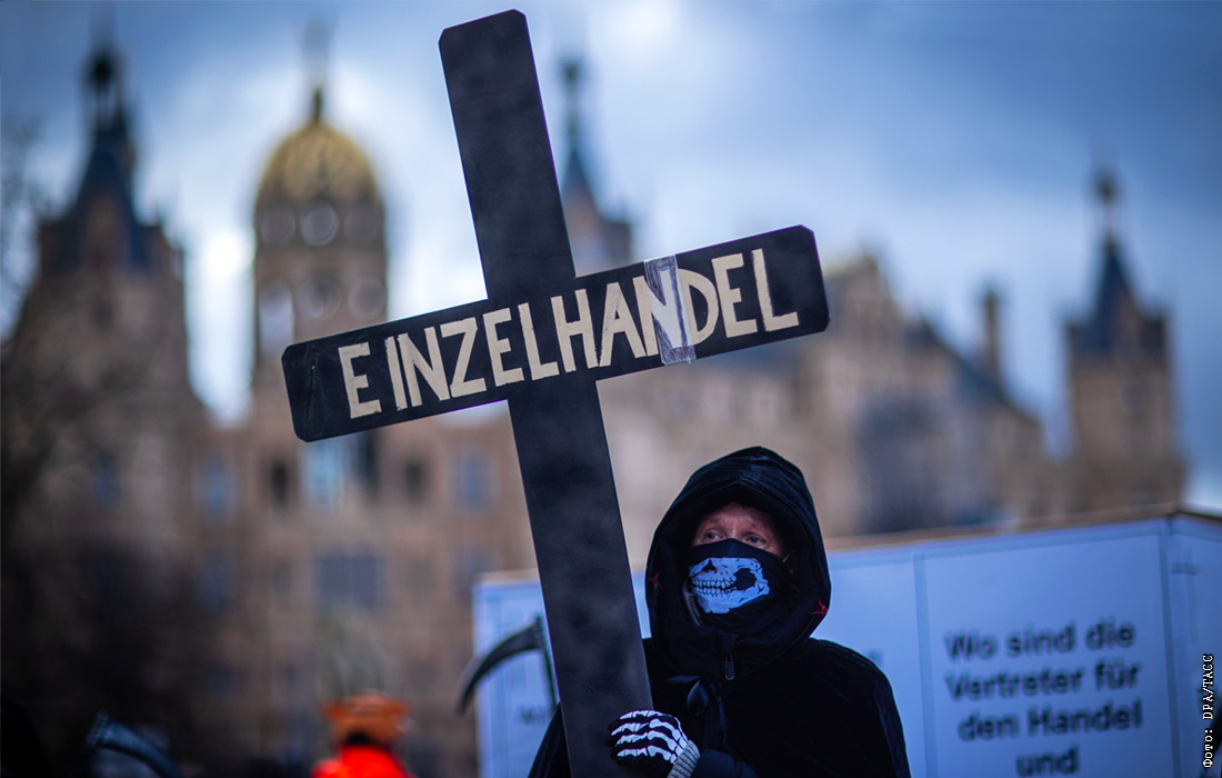 В немецком городе Шверин прошла акция работников торговли и гостиничного бизнеса с требованием снятия жестких коронавирусных ограничений