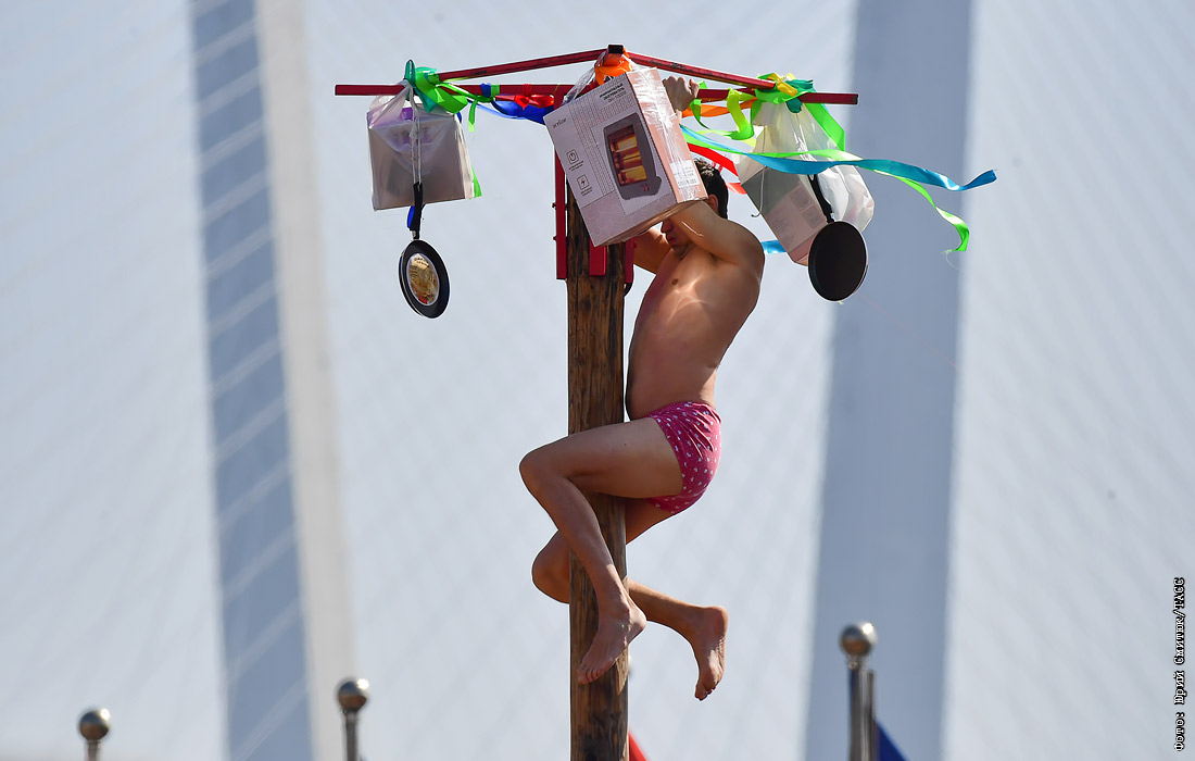 Участник народной забавы "Масленичный столб" во Владивостоке