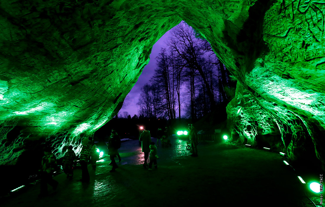 Зеленая подсветка пещеры Гутманя в Латвии