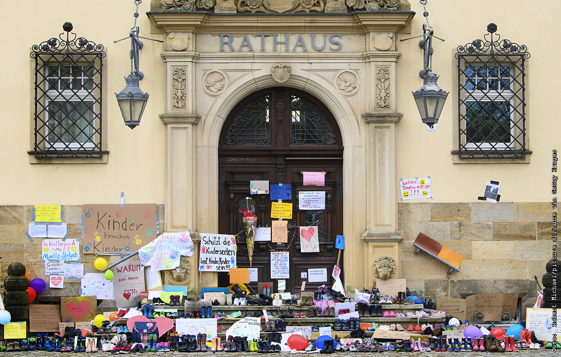 В знак протеста против продления закрытия школ в некоторых районах Саксонии родители скинули детскую обувь перед многочисленными ратушами
