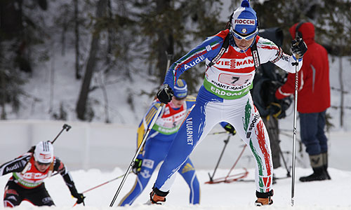 Итальянка Микаэла Понза (на первом плане) на первом этапе смешанной эстафеты 2х6+2х7,5 км на чемпионате мира по биатлону
