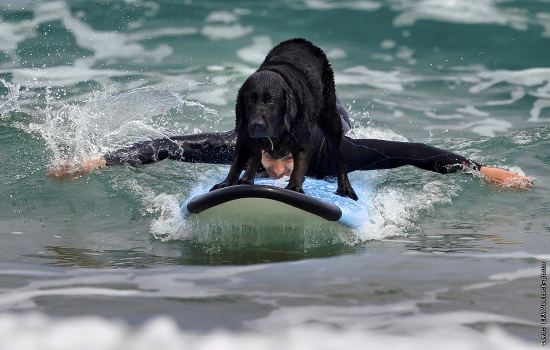 Серфер со своей собакой в Хихоне, северная Испания