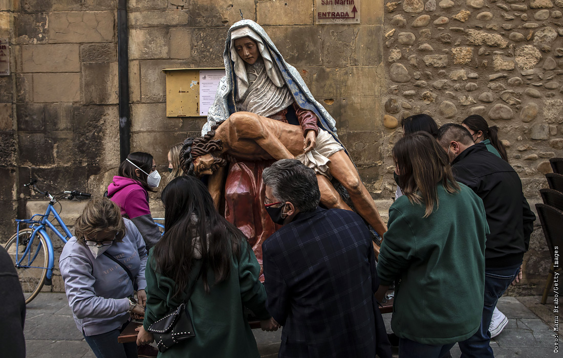 Верующие несут статую Девы Марии в церковь Святого Мартина, где она будет находиться до конца Страстной недели, в Леоне, Испания