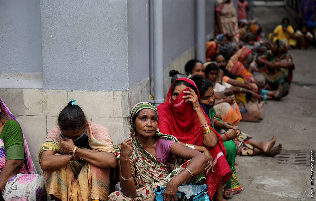 Нуждающиеся собрались перед католическим храмом в Калькутте в ожидании раздачи еды