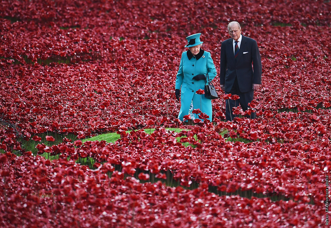 Королева Великобритании вместе с мужем посещают арт-мемориал жертвам Первой мировой войны Лондоне. 2014 год.
