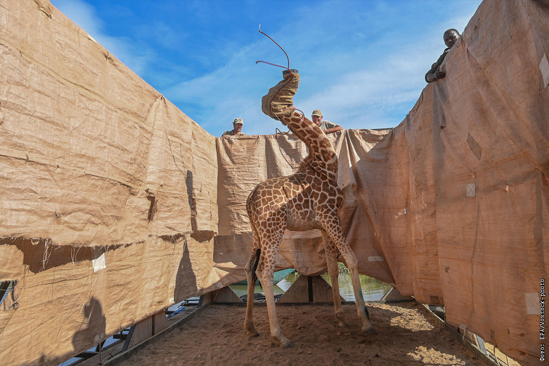 Жирафа Ротшильда перевозят в безопасное место на специально построенной барже с затопленного ливнями острова Лонгичаро в западной Кении.