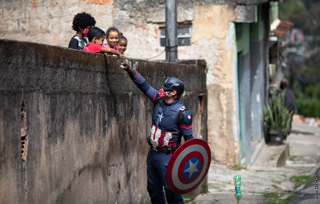 Офицер военной полиции в костюме супергероя приветствует детей. Петрополис, Бразилия.