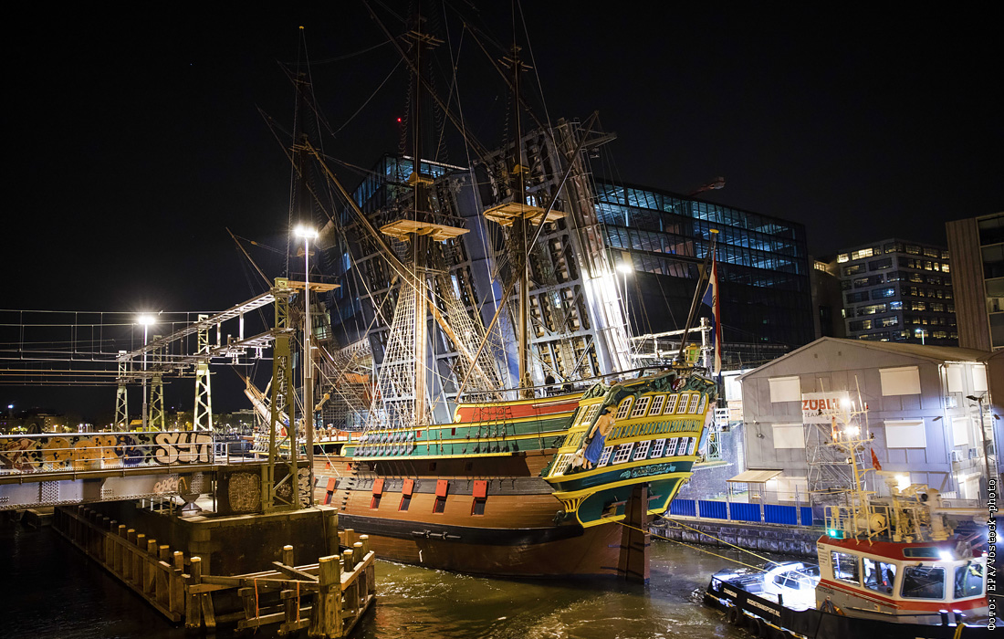 Корабль голландской Ост-Индской компании "Амстердам" плывет к временной пристани после реставрации, откуда он вернется на музейную пристань в Амстердаме