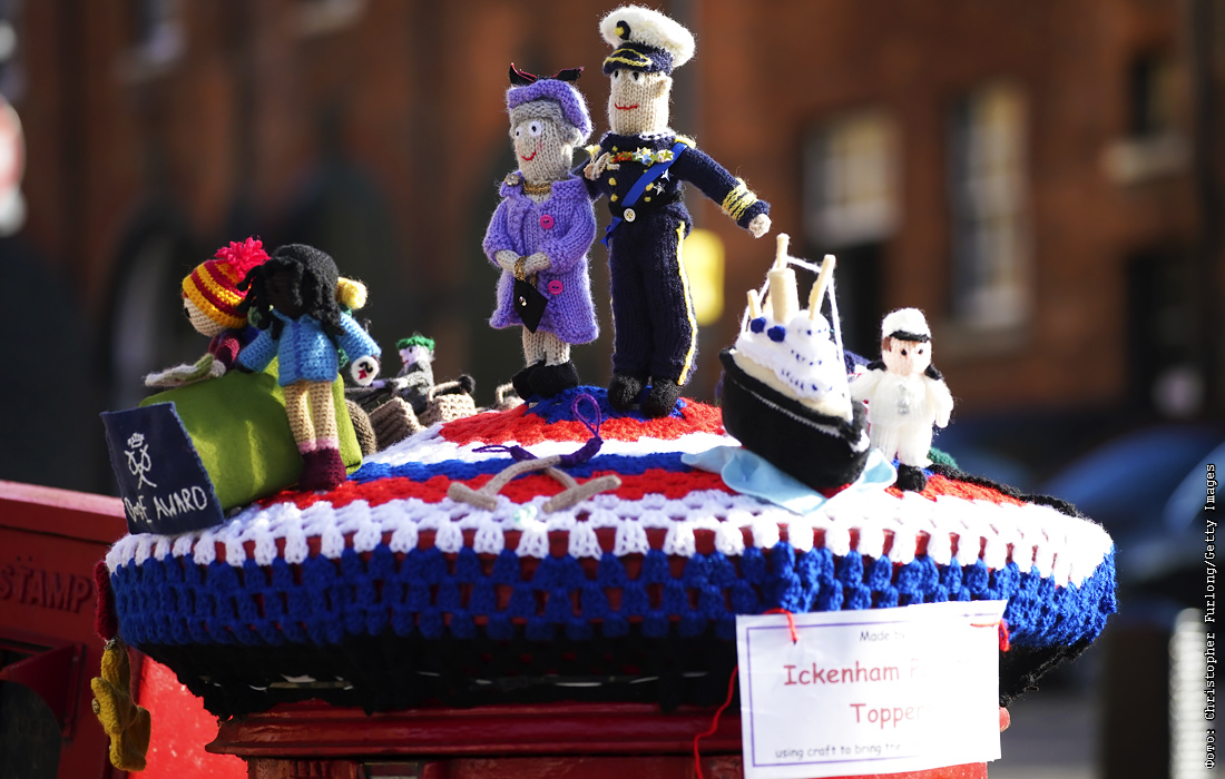 В Великобритании продолжается национальный траур после смерти принца Филиппа. На фото: вязаные фигуры королевы Елизаветы II и ее мужа принца Филиппа украшают почтовый ящик в Виндзоре.
