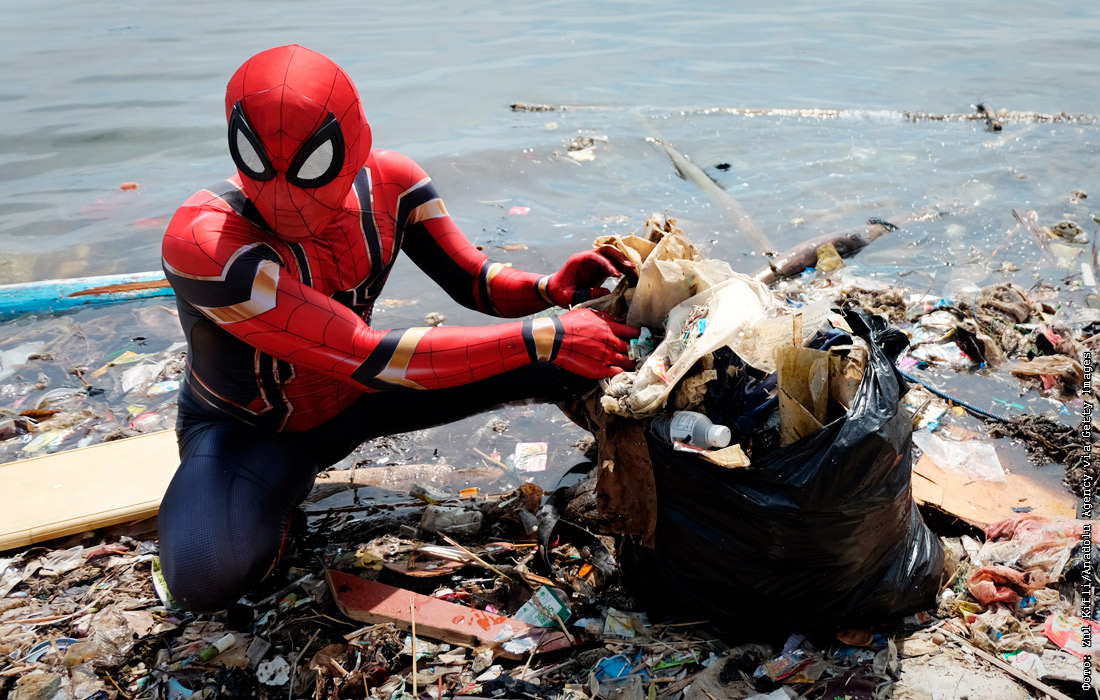 В Международный день Земли активист в костюме Человека-паука очищает от мусора пляжи Индонезии