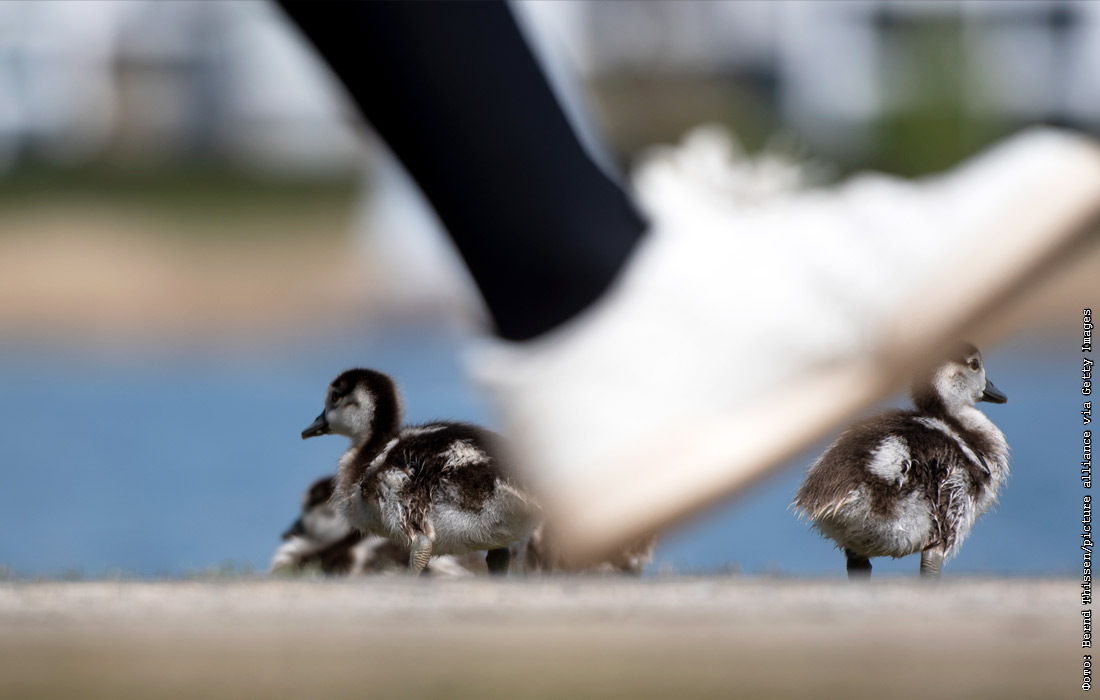 Гусята на берегу озера Феникс в немецком Дортмунде