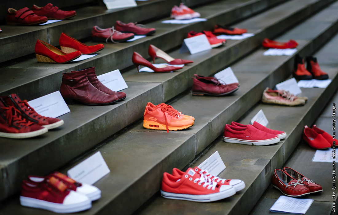 Красные туфли и ботинки стоят перед зданием парламента Нижней Саксонии во время кампании против выхода Турции из Стамбульской конвенции. Каждая пара обуви символизирует женщину, погибшую в результате насилия.