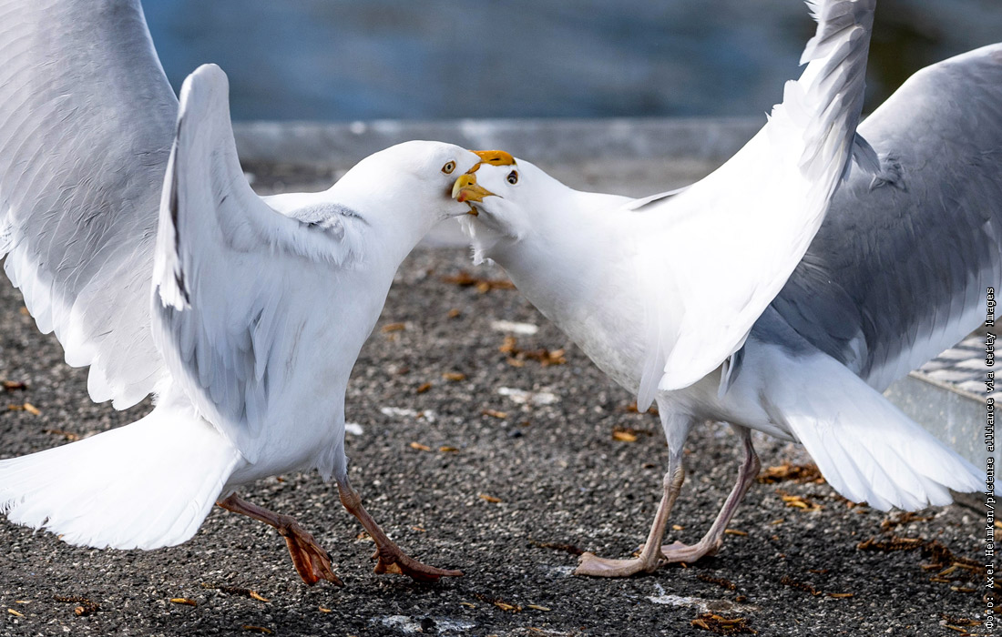Чайки спорят на краю корабельного причала. Шлезвиг-Гольштейн, Германия.