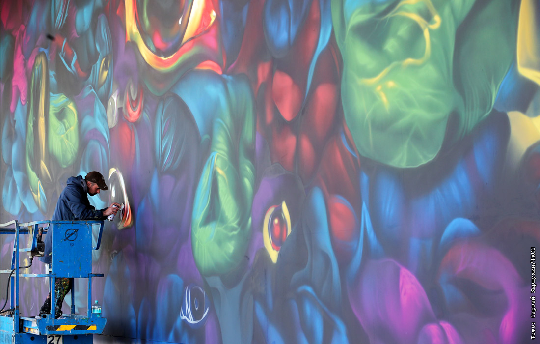 Создание мурала по эскизу художника Александра Купаляна на стене Новой Третьяковки. Команда художника расписывает специально построенную временную конструкцию, ежедневно все желающие могут наблюдать процесс создания арт-объекта.