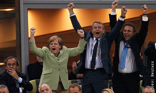 Федеральный канцлер Германии Ангела Меркель наблюдает за четвертьфинальным матчем Германия - Греция в Гданьске. Матч завершился со счетом 4:2 в пользу немецкой сборной