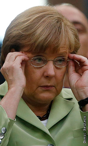 Федеральный канцлер Германии Ангела Меркель наблюдает за четвертьфинальным матчем Германия - Греция в Гданьске. Матч завершился со счетом 4:2 в пользу немецкой сборной