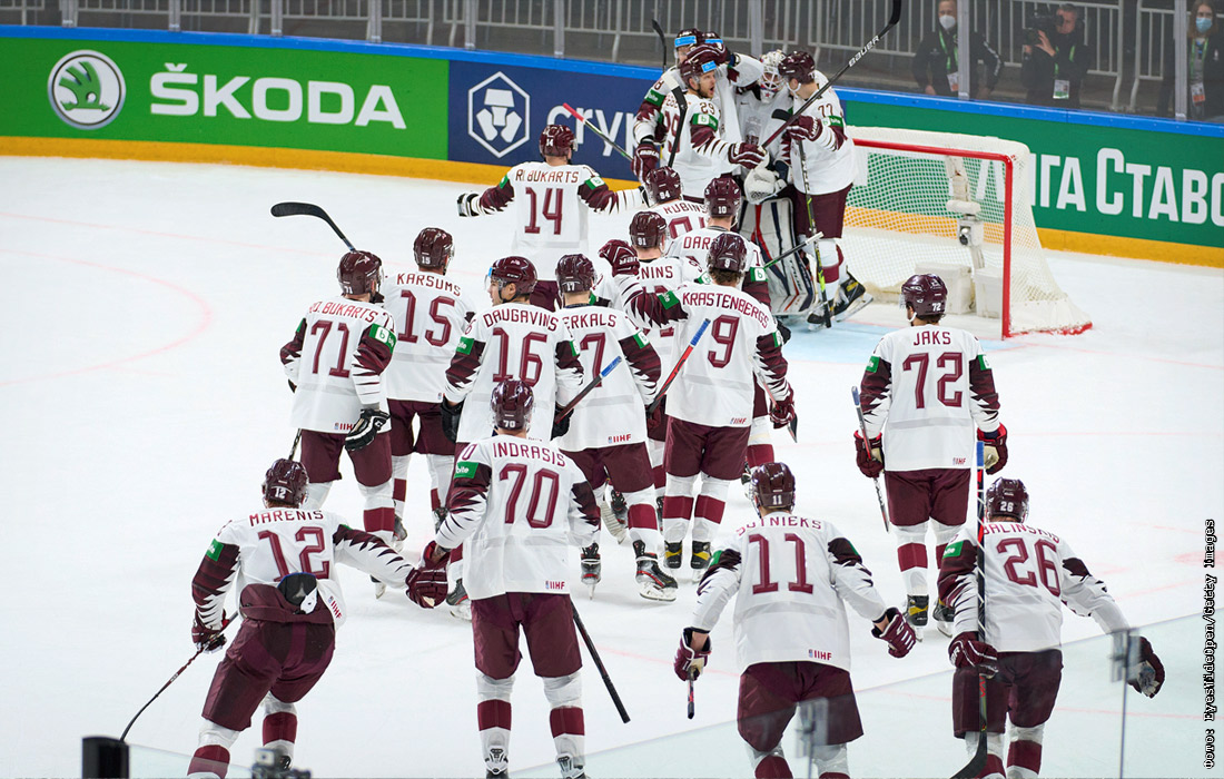 Игроки сборной Латвии празднуют историческую победу над Канадой (2:0)