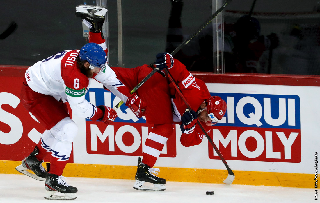 Чех Давид Мусил и россиянин Константин Окулов в матче открытия ЧМ-2021 (4:3 в пользу сборной России)