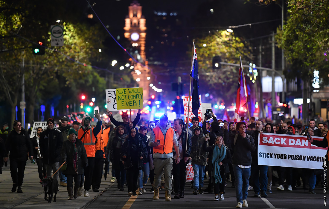 Власти австралийского штата Виктория ввели жесткий карантин на неделю. На фото: акция протеста против изоляции в Мельбурне.