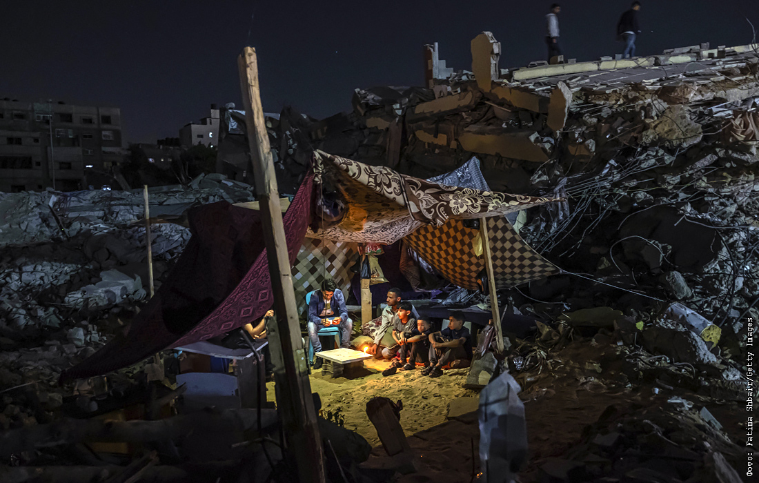 Палестинцы в палатке, установленной на руинах здания в городе Газа