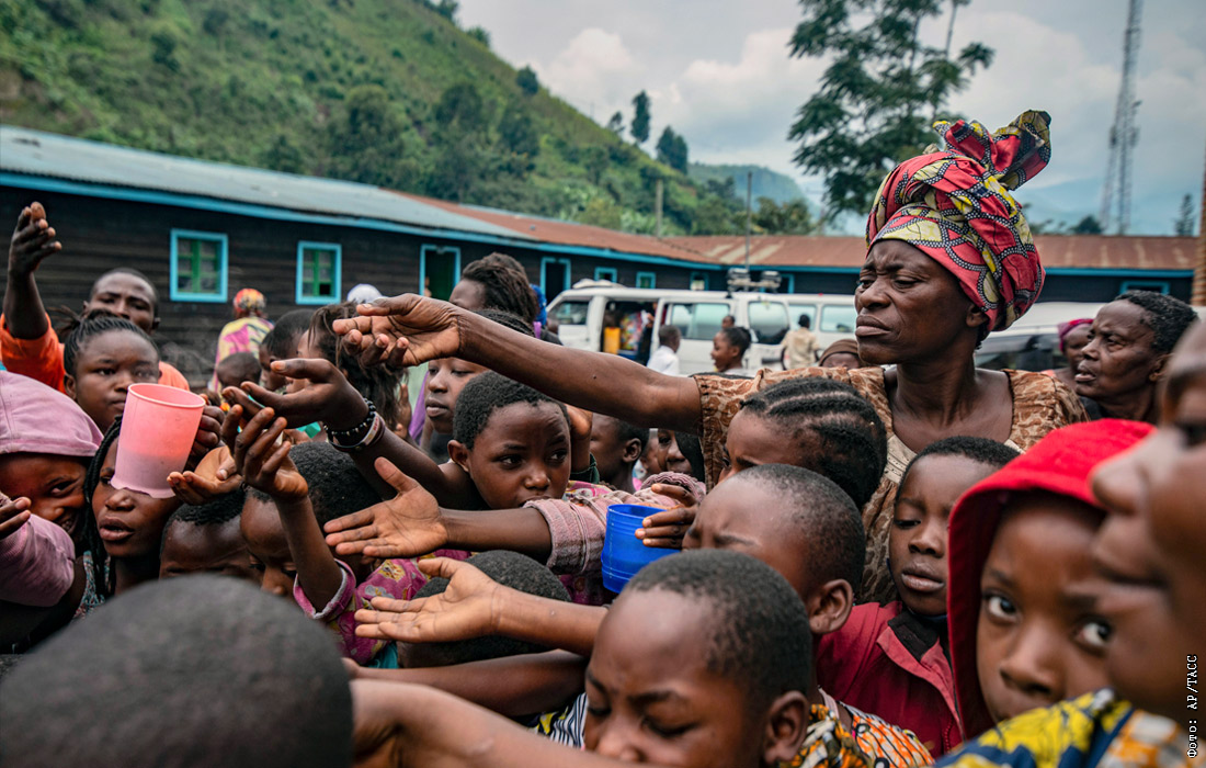 Власти Демократической Республики Конго провели эвакуацию населения города Гома из-за извержения вулкана Ньирагонго, одного из самых активных и опасных вулканов в мире. На фото: беженцы из Гомы в пункте раздачи еды.
