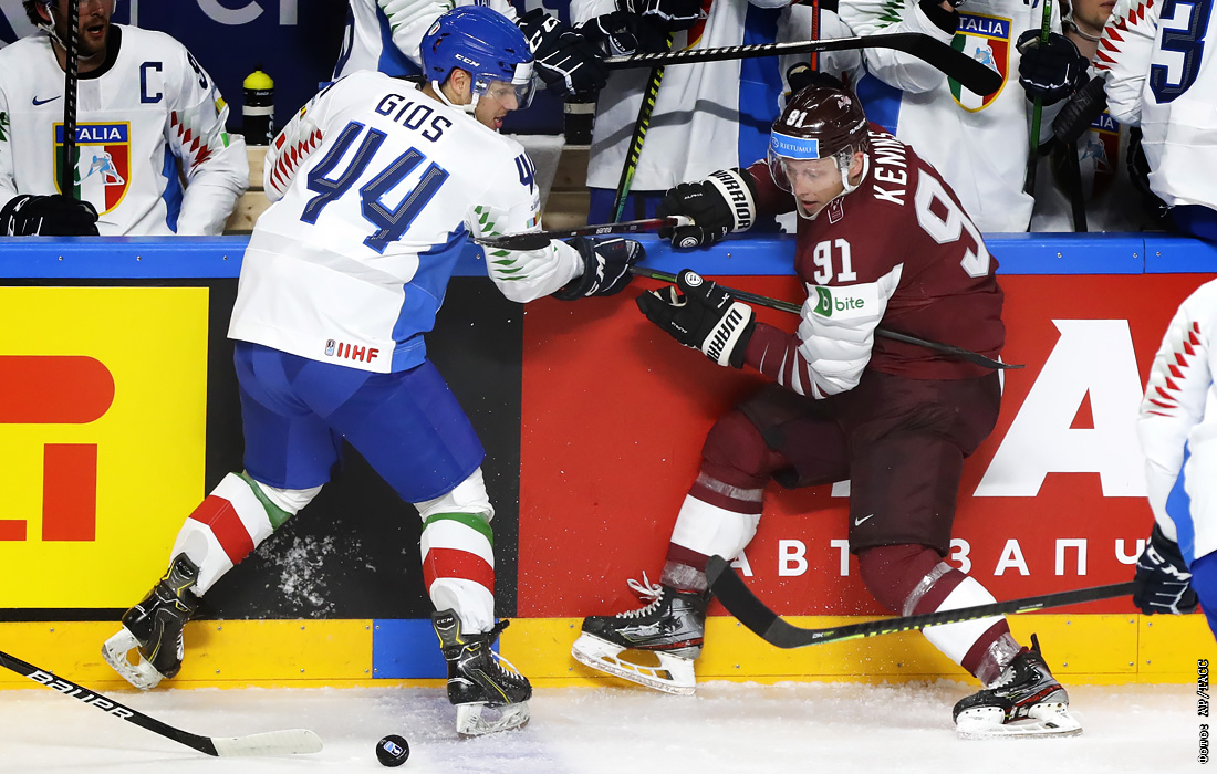 Латвиец Роналдс Кениньш (справа) не сдержался в игре с Италией, его грубое нарушение привело к 10-минутному штрафу. С учетом также малого штрафа он заработал 12 минут.